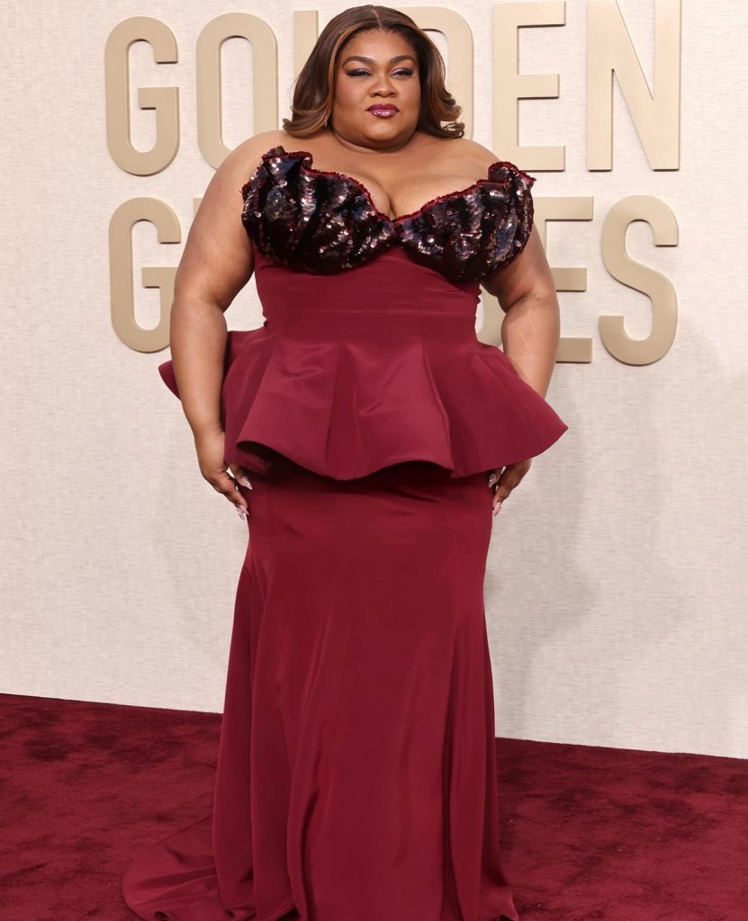 Firstly, can we get into Da’Vine Joy Randolph and how absolutely divine she looked in a deep cranberry Rodarte peplum gown at the Golden Globes? The placement & size of the peplum was perfect for giving the illusion of elongating her legs and shortening her torso. The sequined cups that scalloped (literally) over her chest were expertly crafted and affectionately held her breasts as well. Respectfully, the girls were out and looked gorgeous!