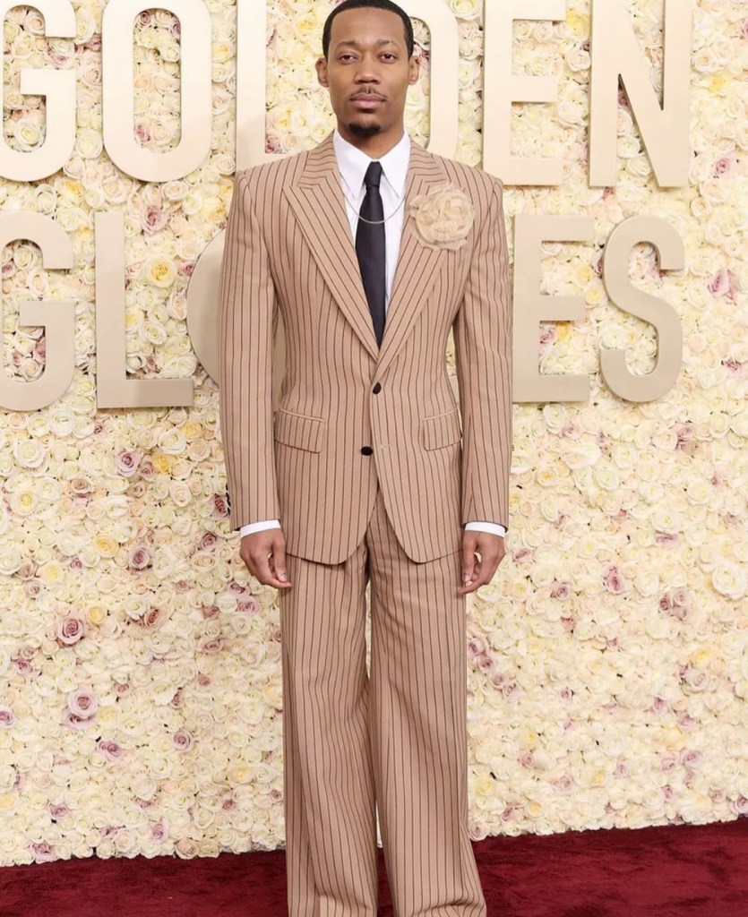 The cast of Abbott Elementary were in attendance at the Golden Globes as well! Sheryl Lee Ralph coordinated with black & citrus green gowns made by Monsoori and Safiyaa respectively. My favorite look from the bunch that night however was Tyler James Williams in a tan Dolce & Gabbana pinstripe suit. What truly captured my attention more than anything about the ensemble was the large floral lapel pin and the fit of the suit itself; cinched waist, padded shoulders and wide, oversized pants. Now the pants could have been shortened a bit to fall on the leg better, but for the most part it was a look!
