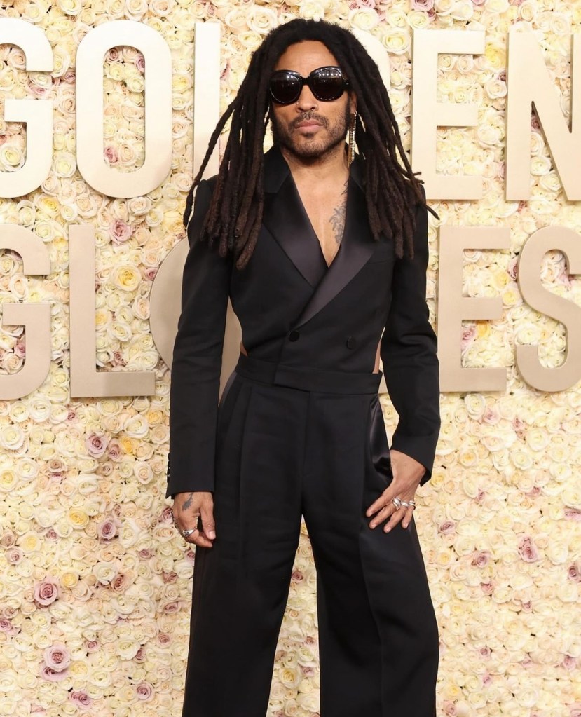 Living legend Lenny Kravitz strolled onto the Golden Globes dressed in an Alexander McQueen jumpsuit. Made to mimic the tailoring found traditionally in suits & tuxedos, the black double-breasted jumpsuit was nicely fitted with velvet peak lapels and side cutouts at the hips. Wide legs and further pocket detailing completed a very overall cool and sexy look.