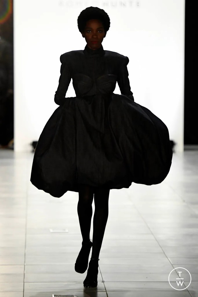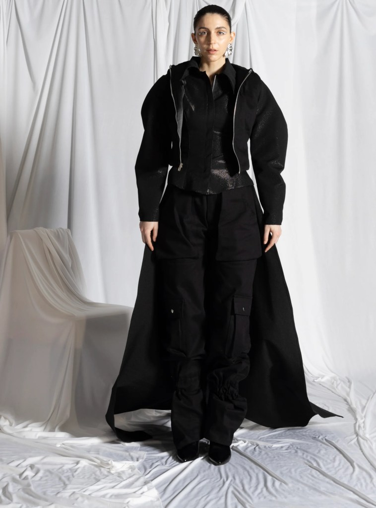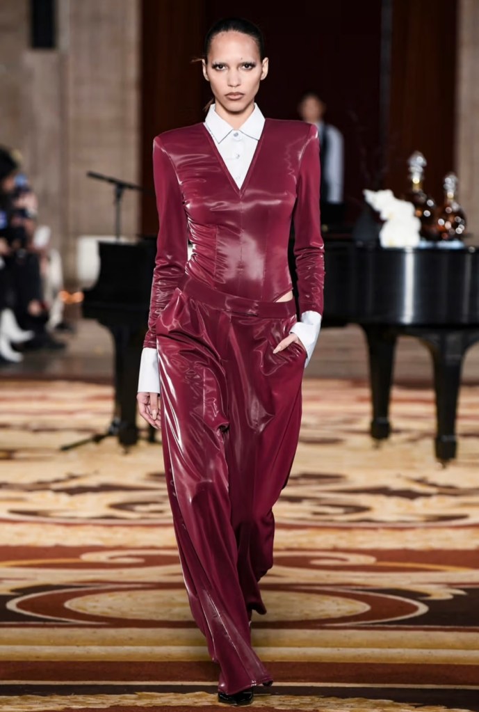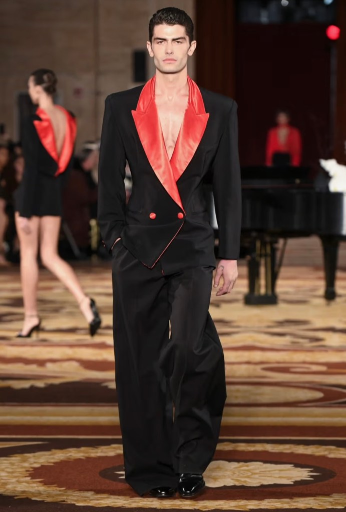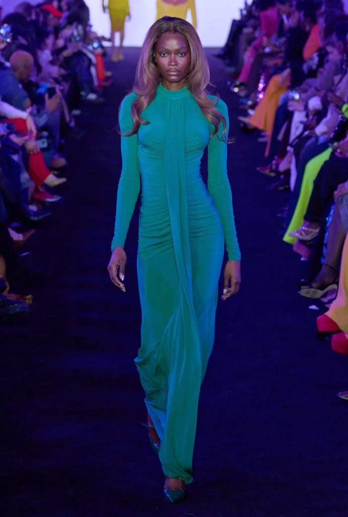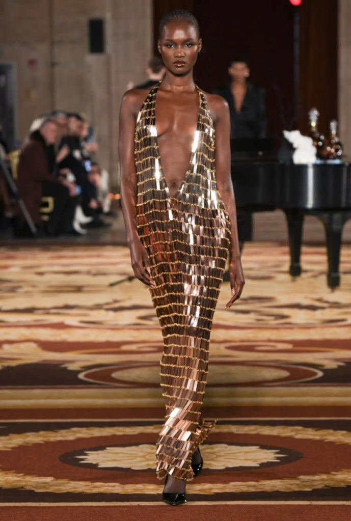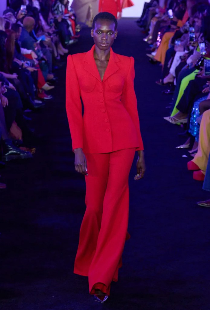 LaQuan Smith’s offerings for FW 24’ was nothing short of sleek, sexy and sophisticated, which is not new for the brand. However what did stand out was Smith’s take on tailoring, which was conceptualized with more softer and malleable fabrics in the form of bodysuits, thigh baring skirt suits and relaxed wide leg trousers. Earth and maroon jewel tones were complemented by the sheen of the fabric used (possibly silk) and the silhouettes were body hugging and curve creating which will definitely appease the long standing LaQuan Smith customer. Those leaning into the recent “office siren” aesthetic would love his pieces, as they’re barely appropriate for any true corporate setting but still cater to the Y2K era with a more business-like twist. His men’s offerings were on trend as well, displaying relaxed dress slacks that flowed with movement as they walked and silk shirts that looked breathable and light alongside with lush outerwear pieces. Outside of the corp-core fashions the runway was also made way to form-fitting dresses, gold gowns and skirts made of metal platelets, and cut-outs in every which way imaginable.